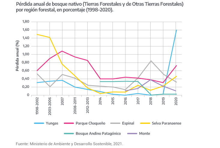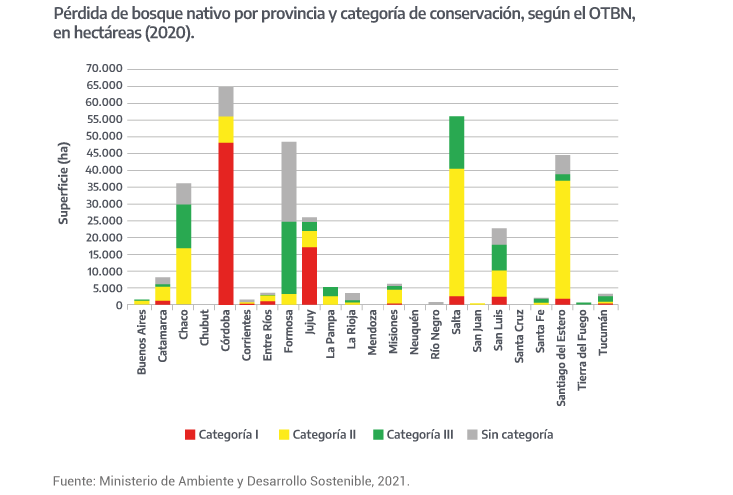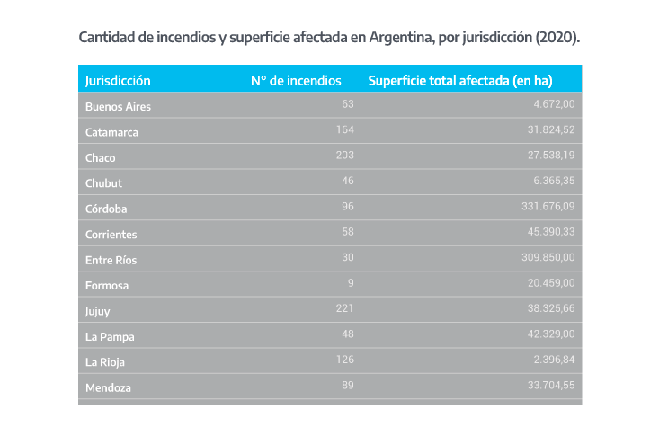 El MAyDS recuperó en 2020 el Servicio Nacional de Manejo del Fuego (SNMF), que lleva un registro diario de los incendios por jurisdicción y la superficie afectada. Según lo reportado en 2020, las provincias de Córdoba y Entre Ríos tuvieron la mayor superficie afectada por incendios (331.676,09 y 309.850 hectáreas respectivamente), un 56 % del total a nivel país.