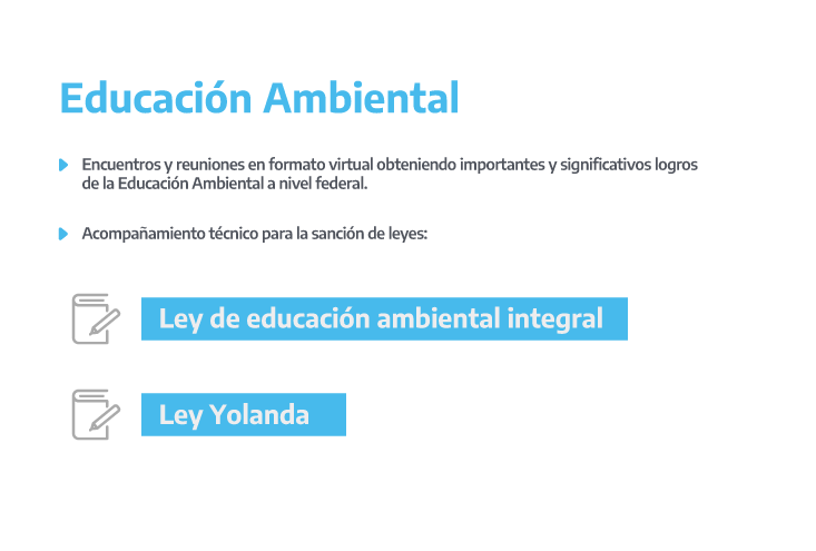 En 2020 en contexto de pandemia, desde la Dirección Nacional de Educación Ambiental del MAyDS se efectuaron diversos encuentros y reuniones en formato virtual obteniendo importantes y significativos logros de la Educación Ambiental a nivel federal, como la coordinación y acompañamiento técnico para la sanción ley de educación ambiental Integral y la ley Yolanda.