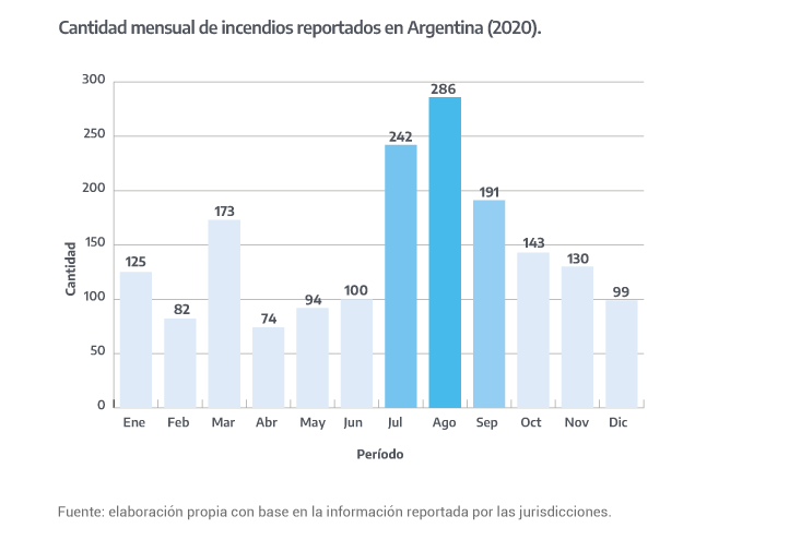 Los meses de julio, agosto y septiembre, con 242, 286 y 191 respectivamente, son los que presentan mayor cantidad de incendios (el 41% de los reportes de incendios recibidos durante el 2020).